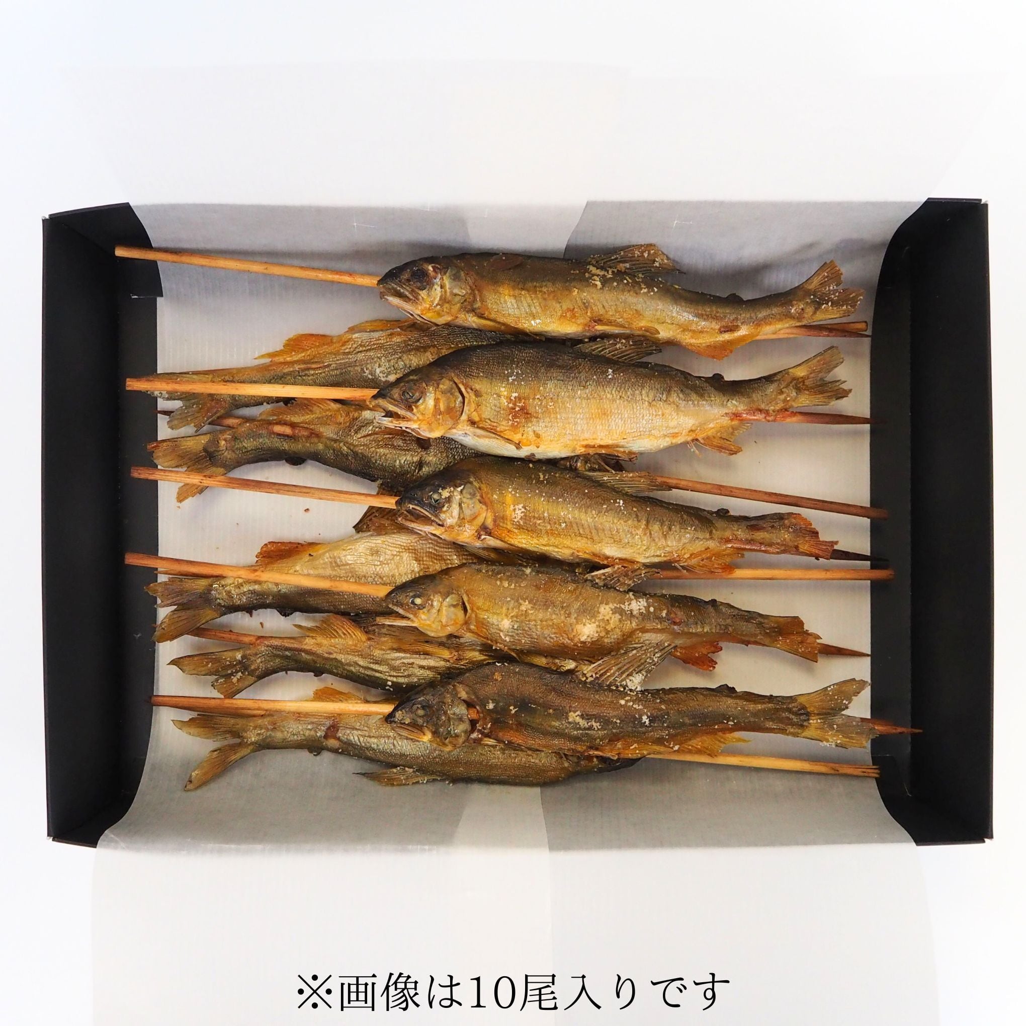 炭火焼鮎を、商標登録「粋鮎(いきあゆ)」のロゴ入り黒箱で発送致します。