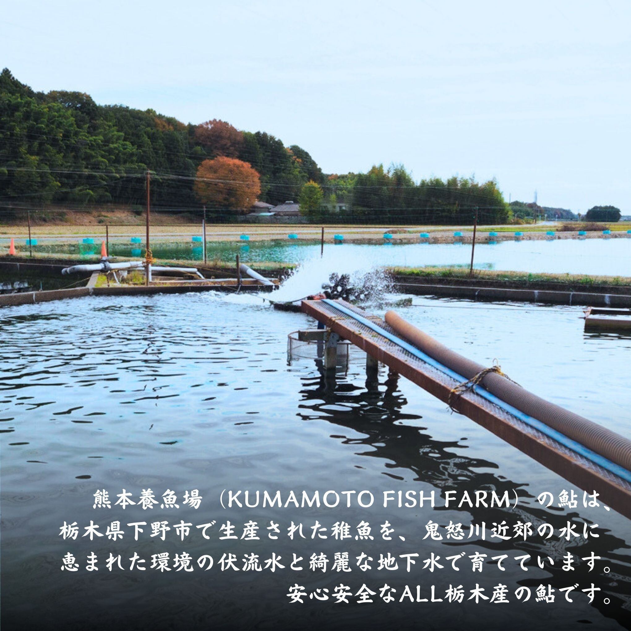 熊本養魚場(KUMAMOTO FISH FARM)の鮎は、栃木県下野市で生産された稚魚を、鬼怒川近郊の水に恵まれた環境の伏流水と綺麗な地下水で育てております。安心安全なALL栃木産の鮎です。