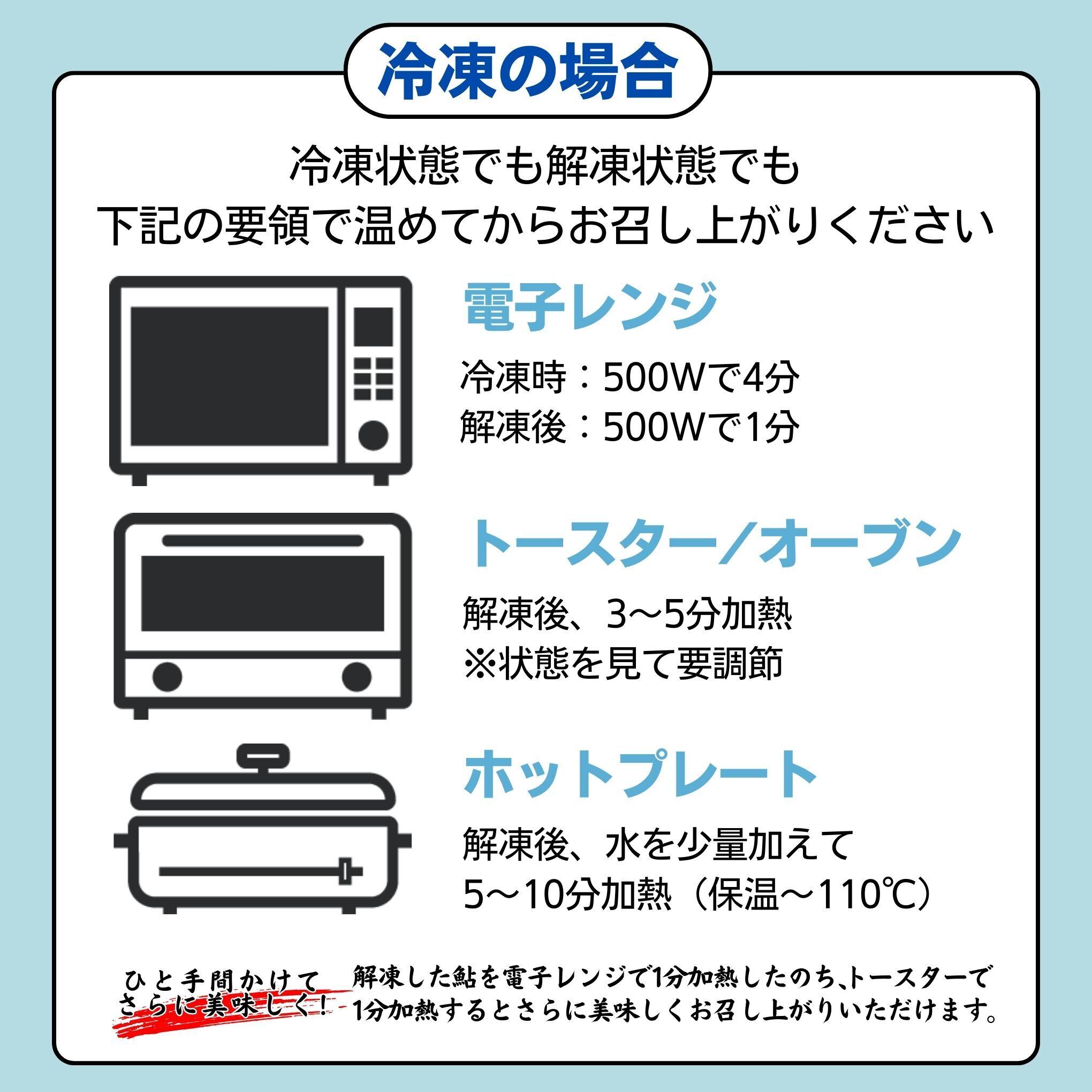 食べ方は、オーブン、電子レンジ、魚やきグリルで温めるだけ。串のままオープンで焼きます。入らない時は串を抜いてもOKです。