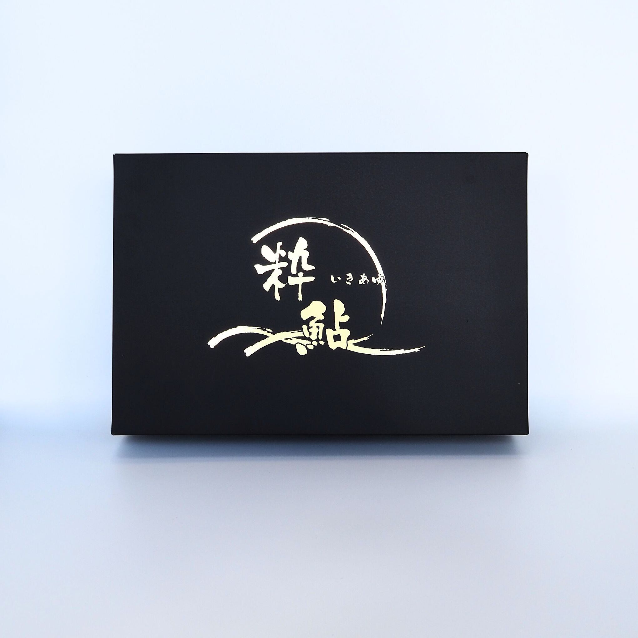 炭火焼鮎を、商標登録「粋鮎(いきあゆ)」のロゴ入り黒箱で発送致します。